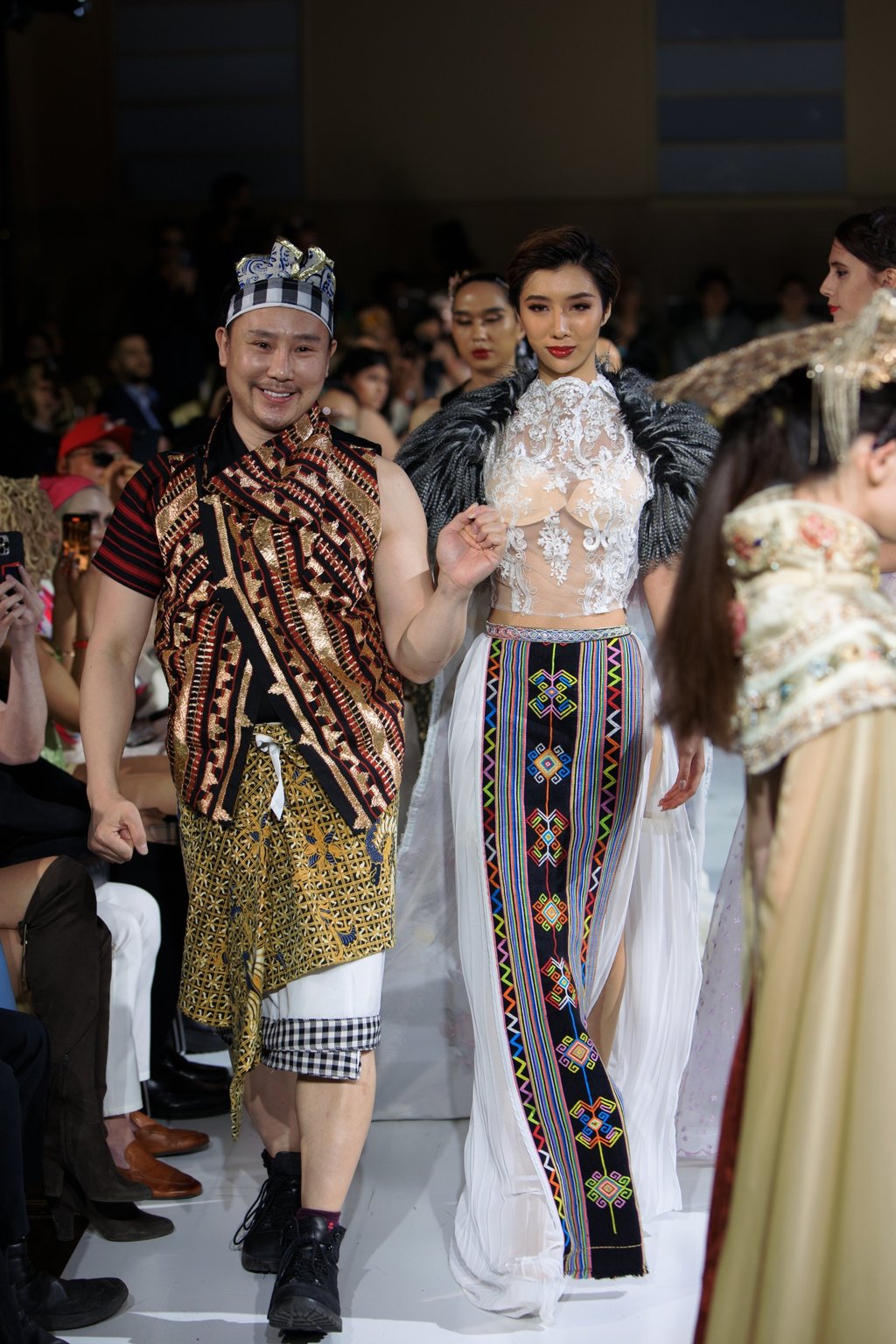 Pearls from Southeast Asia unfolded like a traveller’s journal translated into cloth: garments that hold place and gesture, each seam a small, deliberate echo of island life. Juan Iskandar gathers the region’s textures—Bali’s molten sunsets, the bustle of Thailand’s floating markets, the carved geometry of Chinese temples—and lets them surface as flattened silhouettes, layered panels and trims that move like shadow puppets. The result is neither costume nor pastiche but a careful, lived translation: clothes that perform, then invite a closer, quieter look.