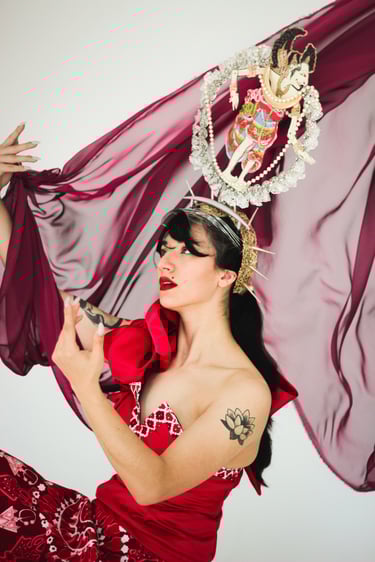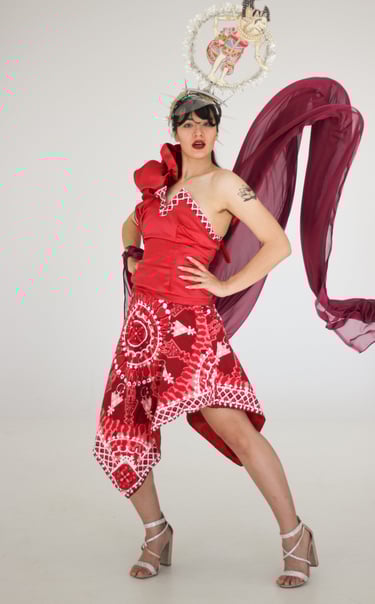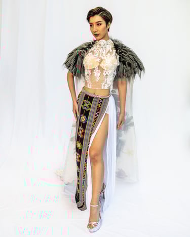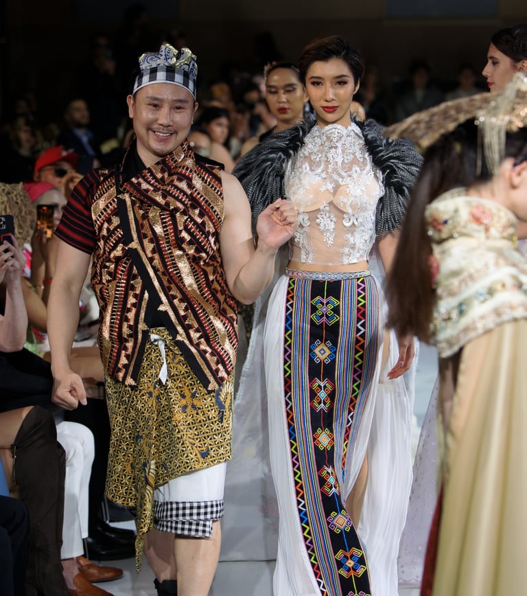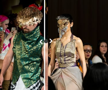 Wayang, the Javanese shadow‑puppet theatre, is the collection’s structural whisper: flattened planes, ritualised movement and theatrical ornamentation shape how each piece reads on the body. Rather than copying iconography, the designs borrow wayang’s grammar—gesture, pause, layered storytelling—so that a walk down the runway reads like a short performance, each look a sentence in a longer cultural conversation.