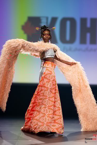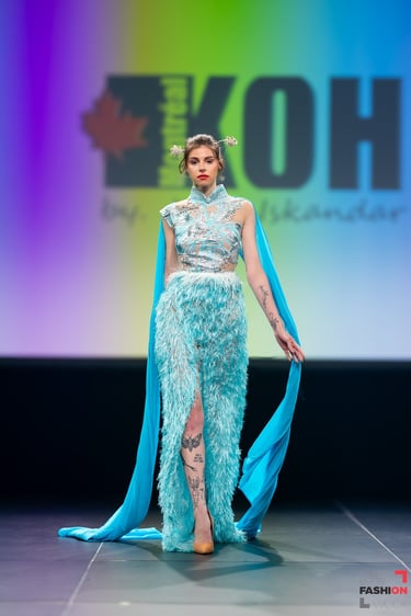 Montreal-based designer Juan Iskandar brought something rare to the stage that night: garments rooted in Balinese folklore, alive with the textile traditions of Palembang. Each piece featured songket fabric — silk woven with benang emas, gold thread — a craft passed between generations in Sumatra long before it ever touched a runway. This wasn't decoration. It was inheritance, cut and sewn into wearable form. The details told their own chapter. Embroidery laid by hand. Beading placed with the kind of patience that can't be rushed or replicated by machine. Fabrics sourced directly from Sumatra gave every silhouette weight and truth.