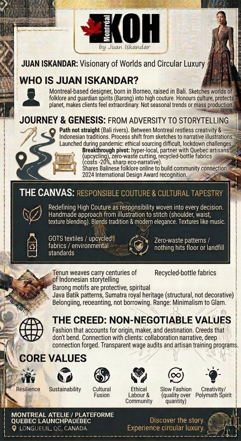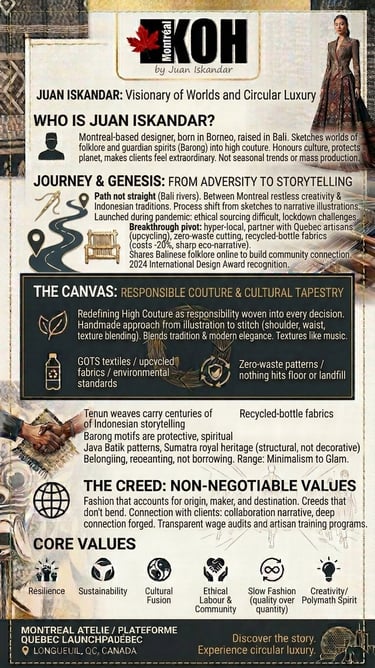 Juan Iskandar is the founder and creative director of KOH Montréal — a luxury fashion house rooted in sustainable couture, cultural storytelling, and handcrafted artistry. Born in Borneo and raised amid the textile traditions of Bali, Juan brings a rare cultural duality to Montreal's fashion landscape: the ancient narrative craft of Indonesia woven into the precision and elegance of Western design.