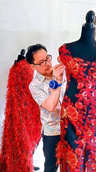 The transition from Bali to the West was not a departure — it was a translation. Juan Iskandar carried with him an entire vocabulary of form, material, and meaning. What he sought was not to abandon that vocabulary but to expand it — to find where the narrative richness of Indonesian craft could meet the structural discipline of Western couture.This convergence became his creative signature. Where Western fashion often prioritizes silhouette and construction, and where Indonesian textile traditions prioritize surface, symbol, and spiritual narrative, Juan found the space between — garments that are architecturally precise yet culturally resonant, structurally modern yet spiritually rooted.His design education and experience in Western fashion systems gave him the technical command of draping, tailoring, and pattern-making. But his eye — the instinct for where a line should fall, where a texture should shift, where a garment should breathe — that remained Indonesian. That remained Balinese.