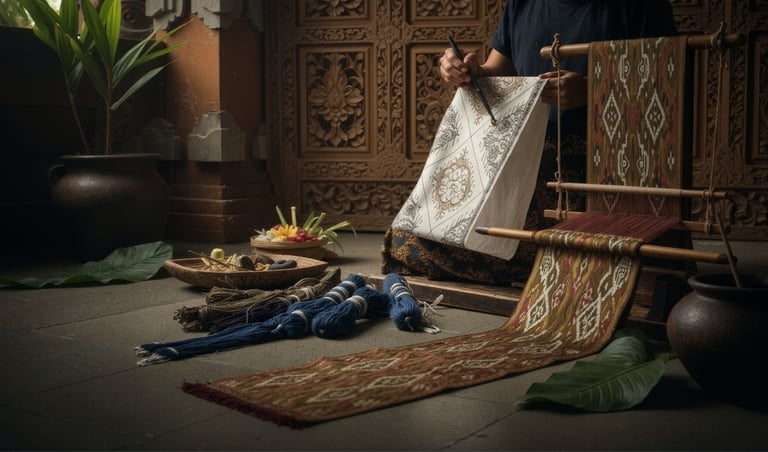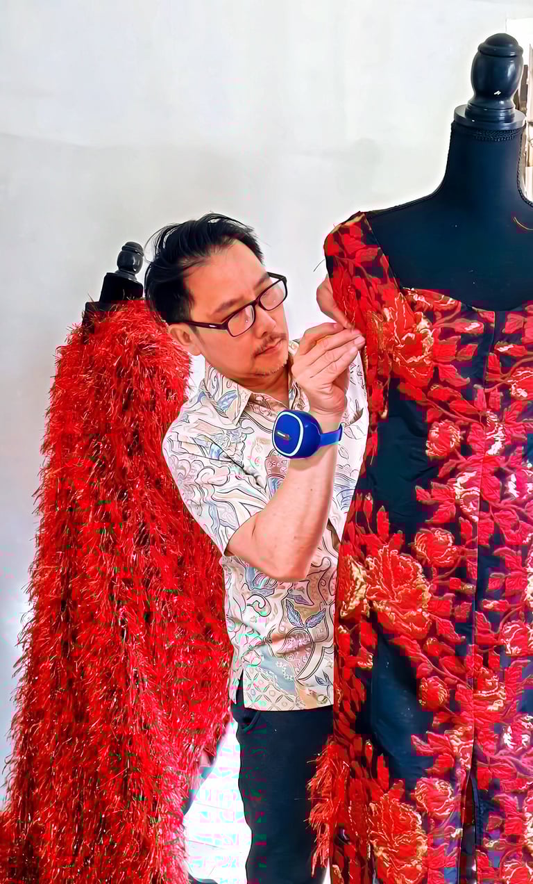 It was in Bali that Juan first encountered the textile traditions that would shape his creative identity: the intricate wax-resist technique of batik, the precise thread-dyeing art of ikat, the ceremonial richness of songket woven with gold and silver threads. These were not museum artifacts to him — they were living practices, performed by hands he knew, in ceremonies he attended, in fabrics his family wore.